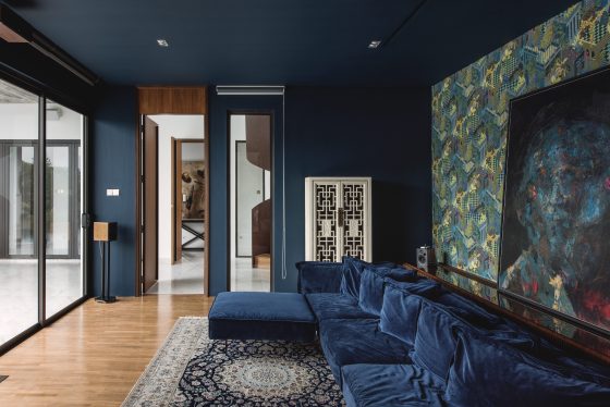 The home theater dons a unique vibrant colour. By including similar timber flooring and motifs of nature, this ensures a cohesive look in the entire house.